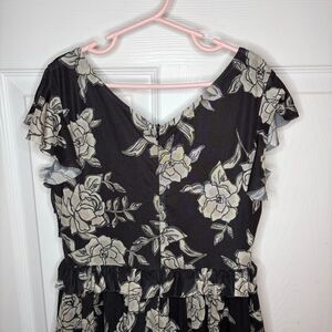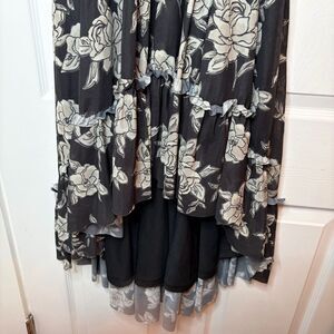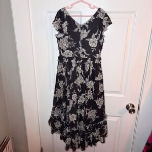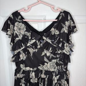 Joyfolie Mia Joy Clarissa Ruffle Dress Asymmetrical Hem Black Beige Floral Girls Size 8. Kids size. Black and beige floral chiffon. Tiered ruffles o. Asymmetric High Low hem. Flutter sleeves. V-Neck. Fitted waist. Flared long skirt that is shorter in front. Delicate fabric and zipper. Perfect for wedding or special occasion. Gently used Good Oreowned Condition.