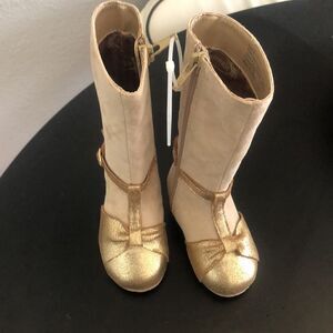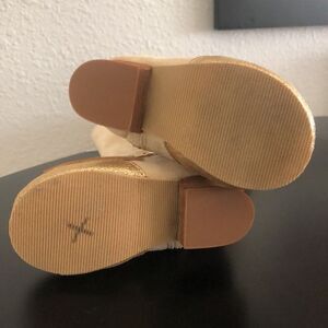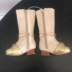 OM Goodness!! How adorable are these?!? New, excellent condition. Vegan Suede in a creamy tan boot with gold vegan leather details. Zippers work great. 1/2 inch heel with non-slip soles. Length is 5 inches. The are as toddler chic as it gets!! Discontinued designer item, rare score!! Only one pair available. Hurry!!! Check out other styles and sizes to bundle and save!
