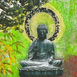 The painting features the artist’s own Buddha photograph from a trip to San Francisco and Chinese character for “joy”, along with bamboo & joss paper elements. The artwork surface is sprinkled with sparkly mica chips for extra interest.