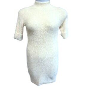 JoyinJoy Cream Fuzzy Knit Bodycon Mini Sweater Dress Mock Neck Gold Button S/M