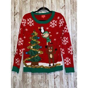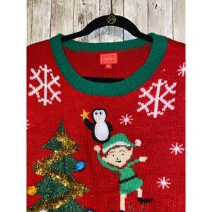 Joyland Ugly Christmas Sweater Rudolph Decorating Tree w/ Elf Snowflakes 3-D