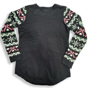 Color/Design: Black knit body with colorful candy cane and snowflade design on sleeves. Front features a Christmas tree with a sequin star topper, Santa peeking near the top, 3D silver tinsel garland and hanging plastic ornament balls; sequins, bows and knit details throughout.
