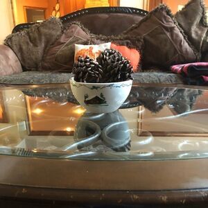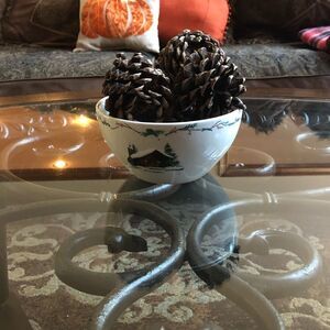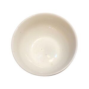 New, never used. Stoneware ceramic bowl. Dishwasher and microwave safe. Pretty off white bowl, featuring a raised snow covered log cabin design. Made by Joyland. Measures: 6" diameter and 3" tall.