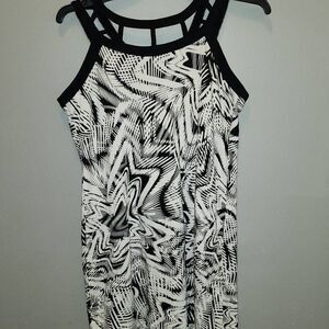 Scoop neck sleeveless Dress has cut out sland beaded detail on neckline with silver embellishments.