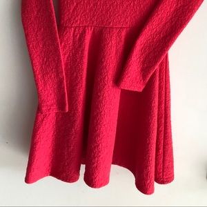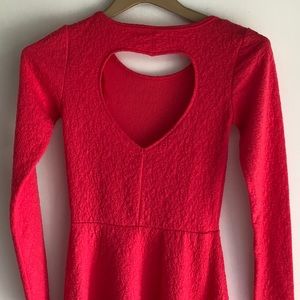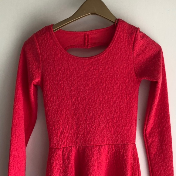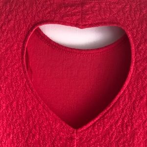 Cute, reddish pink, heart cut out on the back. Great for preteen! Modest higher neck. Quilted like texture.
