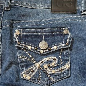 Jr Sz 11 Embellished C3 Carbon Denim Jeans Rhinestone 5 Pockets Flaps Woman's