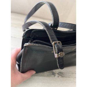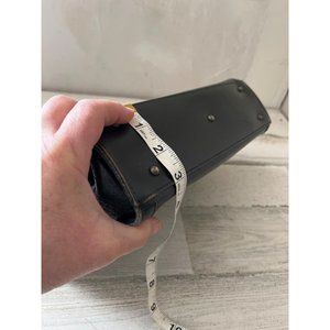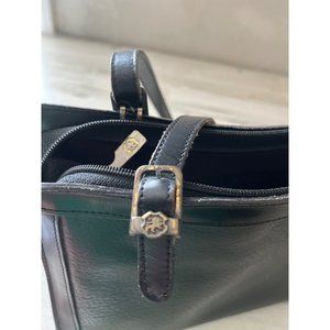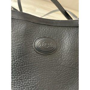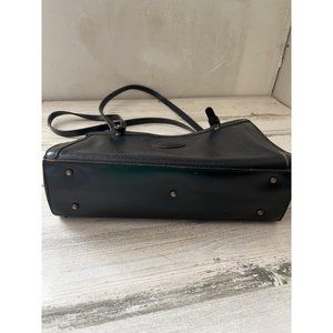 Jr USA woman’s black leather long handled satchel purse. Vintage. Has large zip pocket inside middle. Also has smaller zip pocket. Black pebble leather. Inside has signature moire liner. Footed bottom. Does have some signs of wear on the edges. Buckles on straps show some wear. Otherwise, good overall pre-owned condition.