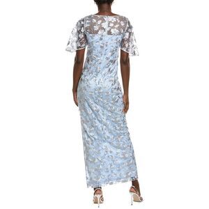 Color/pattern: silver azure Approximately 58in from shoulder to hem Model is 5'10 and is wearing a size 4. Measurements may vary slightly by size. Design details: floral lace embroidery, and round neck Center back zip with hook-and-eye closure 100% polyester Lining: 100% polyester Lining 2: 100% nylon Dry clean only Imported