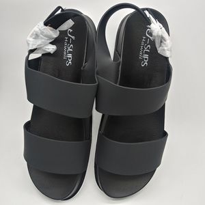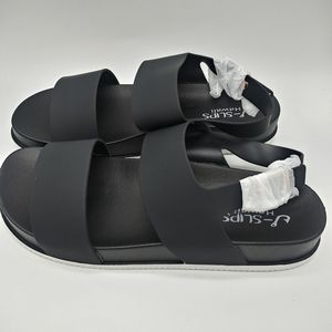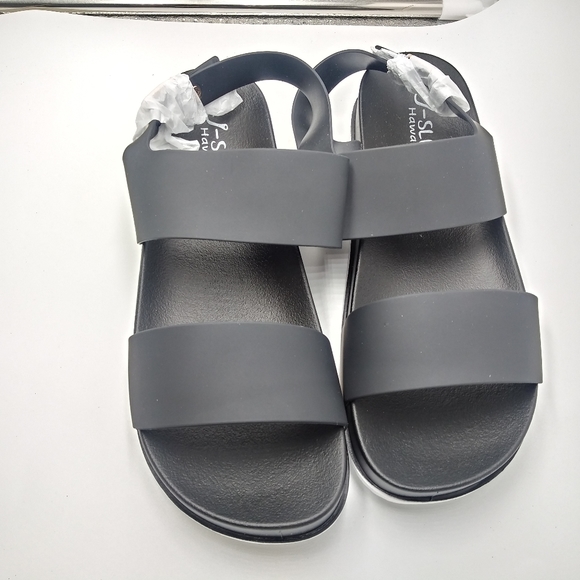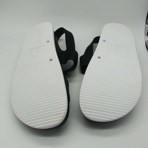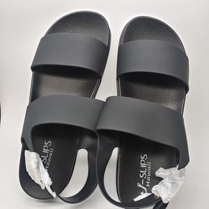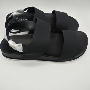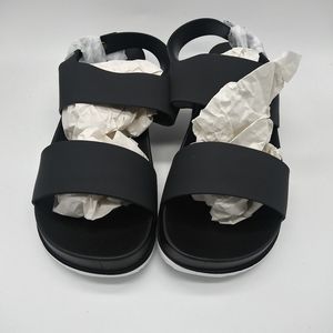 water-resistant slides buckle on the side two straps across the top also a scrap on the back of the heel narrow with