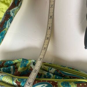 Ju Ju Be Diaper Bag Green Blue Brown Paisley Floral Design. Great pre-owned condition. Minimal wear on bottom corners. Adjustable shoulder strap. 3 zipper compartments. Side pockets. Changing pad. Measures approximately 10"x 12".