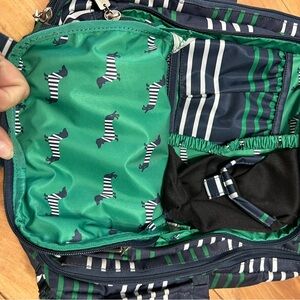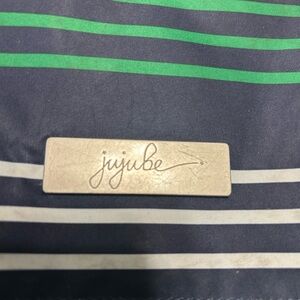 Modern Ju-Ju-Be backpack / diaper bag with navy, white and green stripes. Ideal for everyday use. In excellent condition. Inside is like new with just some wear around the outside edges. Comes with changing pad. Has 5 pockets and the one big opening and two side bottle pockets.