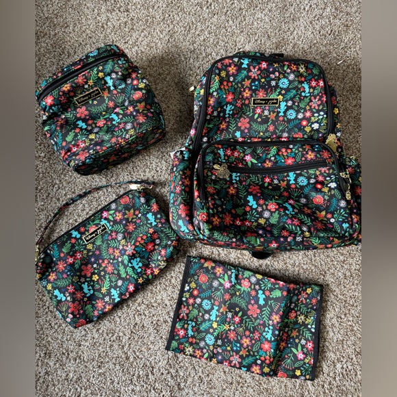 Vibrant floral pattern on a dark base. Includes multiple bags for organization. Perfect for travel or daily use.
