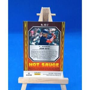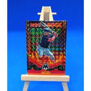 The product is a 2022 Panini Mosaic Hot Sauce Green Prizm trading card featuring baseball player Juan Soto. This sports trading card is part of the 2022 Panini Mosaic set, known for its vibrant and collectible card designs. The Prism parallel adds a unique and shiny element to the card, making it a sought-after item among fans and collectors alike. Perfect for fans of Juan Soto or collectors of sports trading cards, this limited edition card is a valuable addition to any collection.