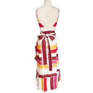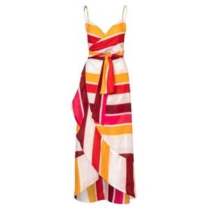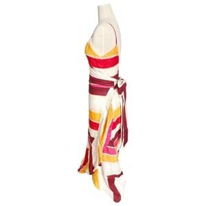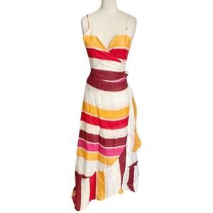Make a bold, elegant statement in this Juan de Dios Sophia Linen Maxi Dress in vibrant fuchsia, orange, red, and ivory stripes. Crafted in Colombia from 100% linen, this wrap-style dress features a deep V-neckline, adjustable spaghetti straps, and a flattering tie-waist detail. The cascading ruffle skirt creates effortless movement, making it perfect for resort getaways, summer weddings, or a sunset dinner. Size Medium with a lightweight, breathable fit ideal for warm climates. Unworn with tags still attached. This colorful designer dress blends artisan craftsmanship with high-end resort style—easy, breezy, and unforgettable.