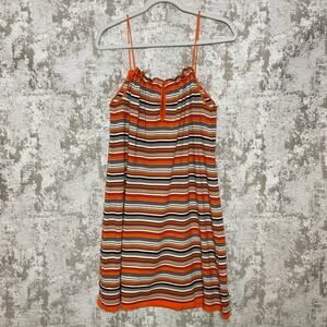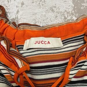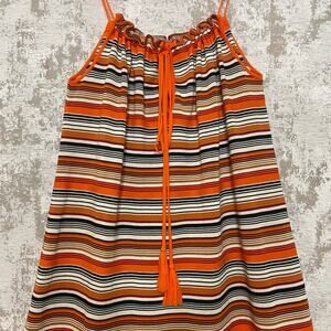 Fantastic dress from Jucca! Features swing, trapeze silhouette, mini length, cotton fabric, adjustable scrunched neckline, keyhole neckline detail on both the front and back, thin adjustable tie with small tassels in orange, and multi horizontal stripe pattern in orange, brown, black, cream, and white.