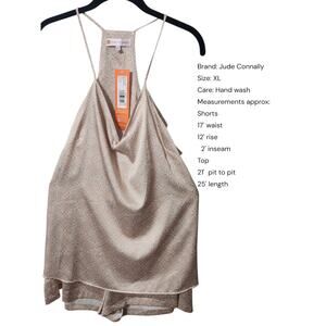 The Jude Connally 2PC PJ Set in XL features a stylish beige color batik medallion print, perfect for the summer and spring seasons. Made from lightweight polyester satin fabric, this sleeveless chemise pajama set has a drawstring closure and is designed for women. The set includes a top with a theme and is a classic addition to any woman's sleepwear collection. Made in the United States by Jude Connally, this 2-piece pajama set offers both comfort and style for a good night's rest.