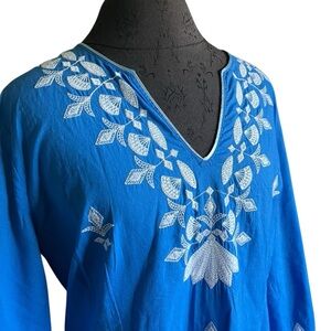 This dress is in excellent condition. The measurements are provided in the photographs. This 100% blue cotton shift tunic dress has beautiful embroidery around the neckline, the hem and the sleeves. Made in India. 100% cotton. 21 inches pit to pit and 32 inches long from the back of the neck to the hem.