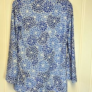 Chic floral design. Pull over style. Perfect for casual or dressy looks. Slit in sides, excellent quality and condition. Measures 18in pit, 28in length