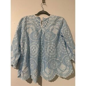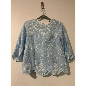 Jude Connally Emboidered eyelet light blue long sleeve top scalloped hems XS