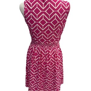 Vibrant fuchsia mini dress with bold white geometric design. Sleeveless and chic. Perfect for any occasion.