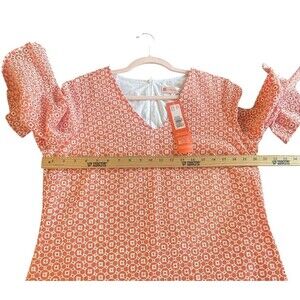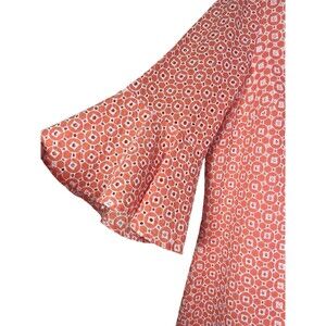 The Jude Connally Kerry Dress in Bamboo Lattice Apricot is a stylish and versatile option for women. This dress features a geometric pattern in a vibrant orange color, with a flattering V-neckline and 3/4 bell sleeves adorned with ruffle accents. Made from lightweight cotton fabric, this short shift dress is perfect for various occasions such as travel, parties, or casual outings. The dress is machine washable and lined for added comfort, making it a practical and fashionable choice for the summer, fall, and spring seasons. Made in the United States, this Jude Connally dress combines colorful charm with classic style.