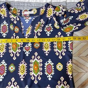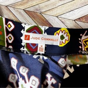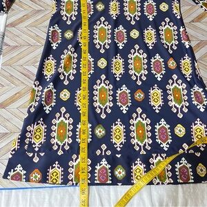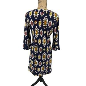 Jude Connally Navy Blue Boat Neck Shift Dress V-Neck Retro Print 70's Stretch