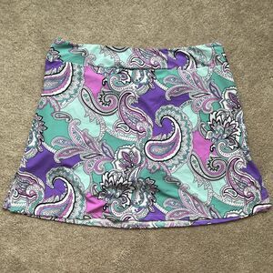 Vibrant paisley skort with purple and teal hues. Comfortable and stylish for any casual outing.