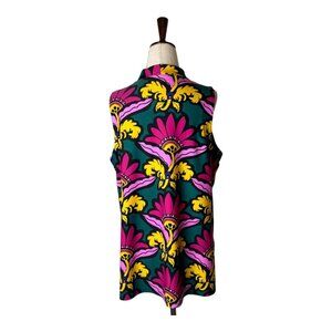This sleeveless blouse combines vibrant floral patterns with a classic high neckline. Ideal for stylish summer outfits or layering under jackets.