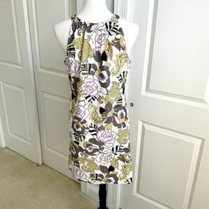 Jude Connally L Gray Purple Floral Hi Neck Stretch Dress Coastal Casual Preppy. Bust is 20 in across, length is 36 in