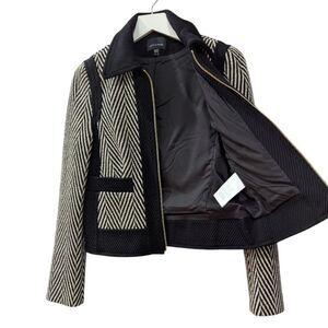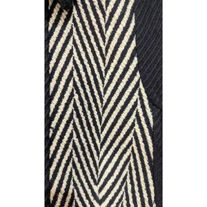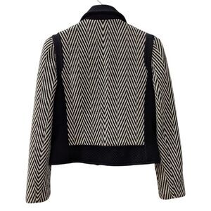 Elevate your style with this chic black and white chevron jacket. Perfect for any occasion, this jacket offers a sophisticated look with its bold pattern and classic design.