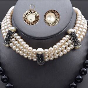 Stunning Set by Judith Jack includes both the Three Strand Choker Pearl & Marcasite Necklace and the Earrings — Sterling w/Marcasite and Faux Pearl.