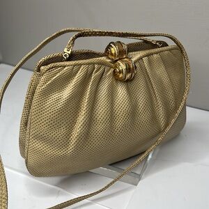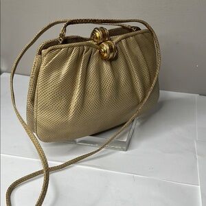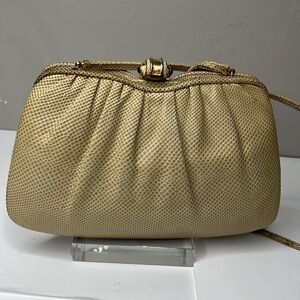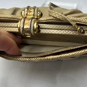 This is a great Judith Leiber Lizard Top Clasp Clutch Shoulder Bag. Vintage, good condition. The strap can be hidden to be used as clutch. Cobochon and goldtone snap closure. Some wear to the closure.Zipper and slip in interior compartment. No odors. Minor wear the edging. Slip in hidden outer compartment. 8.5” x 5” x 1.25”
