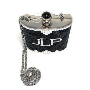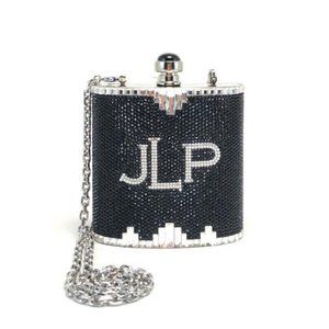 Elegant silvertone flask gleaming with a logo design of rhinestone overlay.