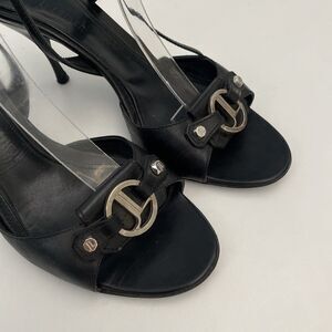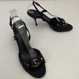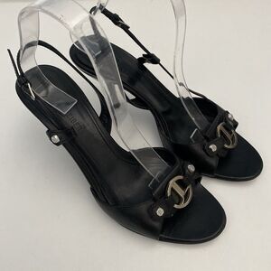 Judith Leiber Sandal Black Leather Slingback Open Toe Silver Logo Slim H…