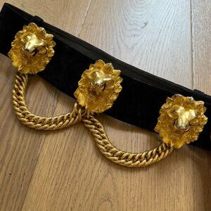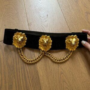 It features 3 very large gold tone metal lions heads with drop chains on a black suede leather belt.