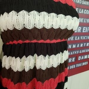 Pretty one shoulder dress. Crochet style knit stripes on red, brown, and white. Elastic stretch at waist and sleeve hem. Lined.