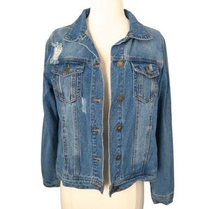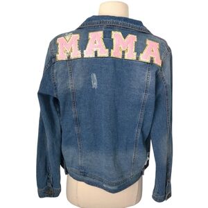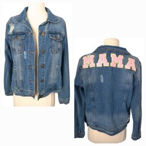 Judith March Mama Blue & Pink Distressed Denim Jean Jacket