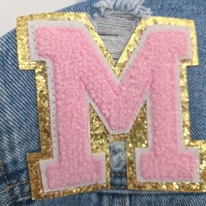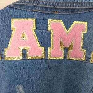 Blue distressed denim with MAMA in pink sherpa letters with gold glitter edges. Note: Stitching on letters does not go to edge, so tips lift a little (see photos).