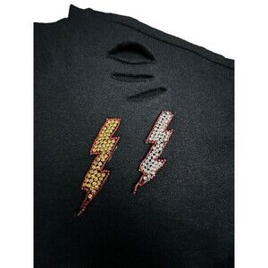 Look stylish and comfortable in this Judith March Medium Heather Black Lightning Bolt Soft Sweatshirt. The pullover sweatshirt is made of a cotton blend material with a knit fabric type. It features an oversized style, long sleeves, and a round neckline. The sweatshirt is perfect for any occasion, especially activewear. It comes in black color with rhinestone accents that add a touch of nature, designer, festival, college, and fun to your outfit. The sweatshirt is a regular size type and is suitable for women. It has a solid pattern and is part of the Judith March product line. Great preowned condition.