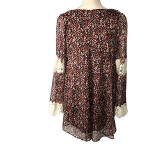 Judith March Mini Dress Long Bell Lace & Sheer Sleeves Brown Floral Size Medium