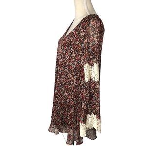 Judith March mini dress in multi color florals on a brown background. V-neck pullover with long sheer sleeves with feminine lace insets that bell at the wrist.