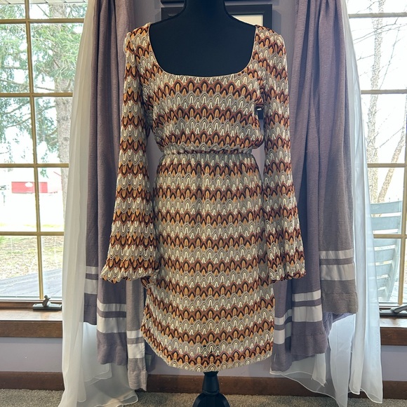 Stylish mini dress with a vibrant multicolor pattern. Features long sleeves and a flattering fit. Perfect for any occasion.