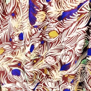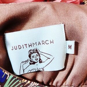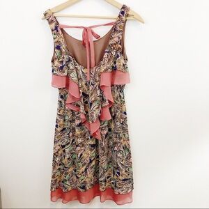 Judith March peacock feather print dress. Ruffle on the back and an attached pink slim that peeks out from the hemline. The peacock print is cream, brown, pink, gold, and blue. Women's medium, bust (pit to pit, flat lay): approximately 17", length: approximately 35". 100% Polyester