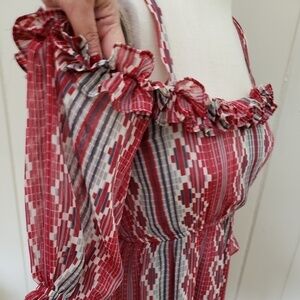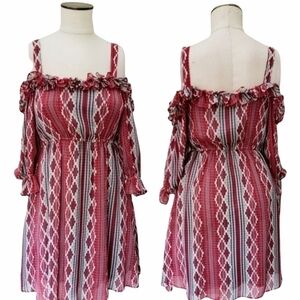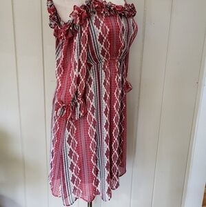 Beautiful red and gray print dress. Straps plus off the shoulder long sleeves. Ruffles around the neckline and shoulders.
