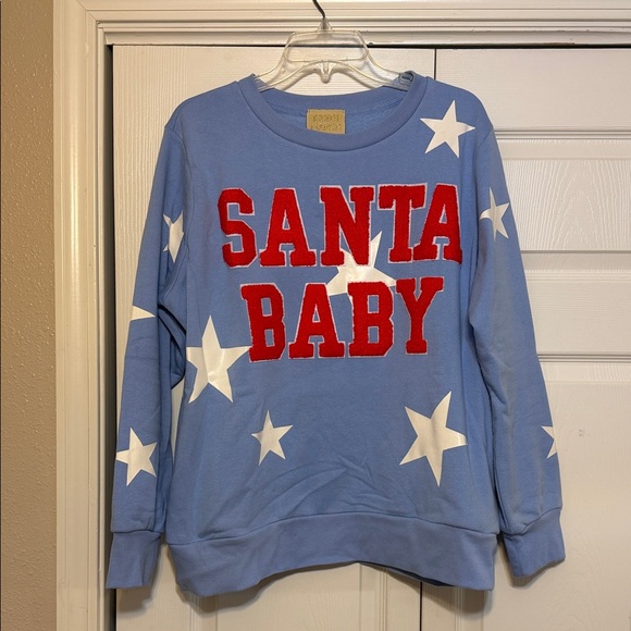 Light blue sweatshirt with stylish varsity letter design. With pockets! Cutest holiday sweatshirt!!!!!!! It’s one of those shirts you can’t wear year after year to holiday gatherings! So my loss is your gain-