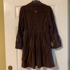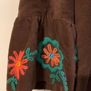 Judith March Brown 3-tiered brown velveteen jacket with bell sleeves. Looks great over fun patterned dresses and colorful layered clothing. The hand stitched appliqué and fabric covered buttons set this jacket off from all others. Like new condition and smoke-free/pet free home