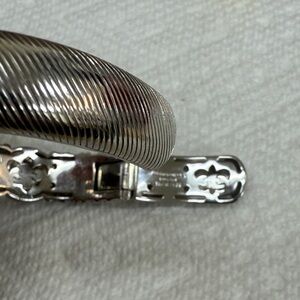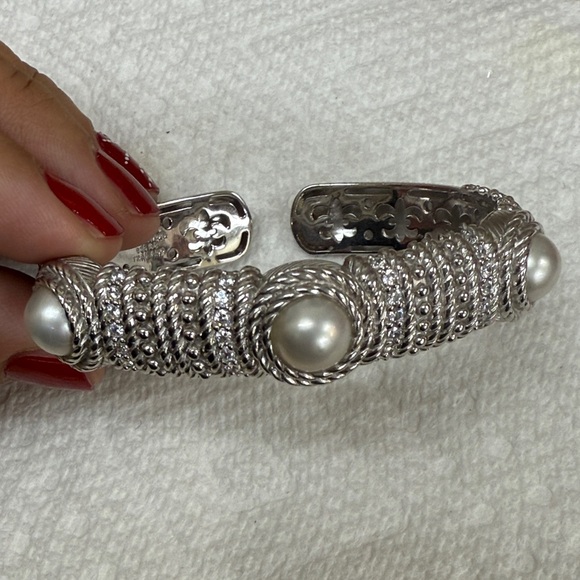This elegant silver bracelet features stunning pearl accents, perfect for adding a touch of sophistication to any outfit.