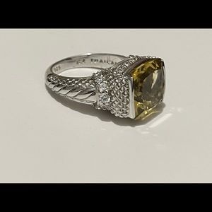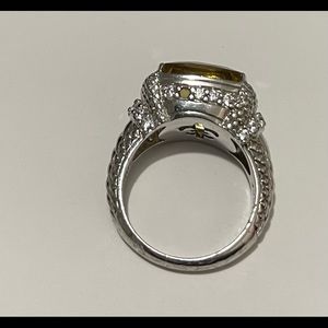 Beautiful Judith ripka sterling ring with yellow stone, ring has some deep scratches in the inside from removing a ring guard please see fotos also missing 2 stones as seen in the last 2 pictures