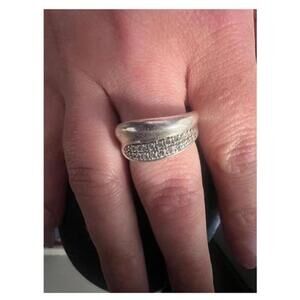 A ring featuring a band design with pave set stones. The ring has a smooth finish and a contemporary style.