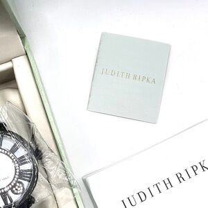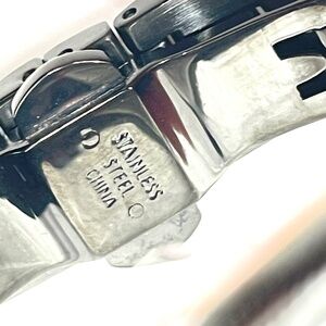 Judith Ripka London NIB black stainless steel watch with a mother of pearl face accented with Diamonqiue stones. A NEW BATTERY WAS INSTALLED -- SEE VIDEO TO SEE IT RUNNING. I don't think this has been worn. Roman numeral face. I purchased this at an estate sale. Please ask if you have questions. The face is about 1 3/8" in diameter and the band is 1/2" wide. Water resistant. Measures 2 1/2" across. Fits up to a 7" wrist.